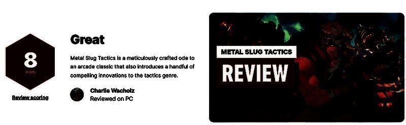 IGN为已经发售的《合金弹头:战略版》打出了8分的评价,认为这款游戏不仅是对经典街机的致敬,还引入了新的玩法机制。目前本作已经登陆全平台。