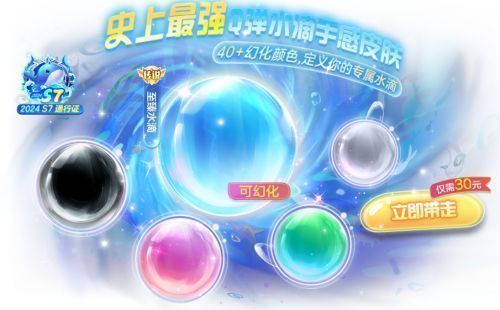 7月1日~7月7日,购入S7通行证将获得史诗关键词[瓶中海盗船],使用豪华通行证点击直升80级,更能立刻解锁《球球大作战》首款可幻化水滴关键词「至臻水滴」,超绝拟真水滴手感,让你获得独一无二的对战体验。这一皮肤已经加入卡奥斯幻化坊,多达40多种幻化焰色,让你自定义打造梦幻炫彩水滴。