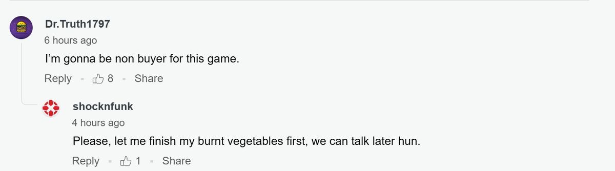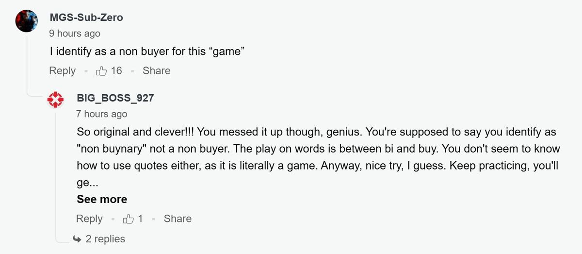 有意思的是,即便光速降价,国外玩家也没有购买的欲望,甚至有玩家在留言区调侃《龙腾世纪:影障守护者》的ZZZQ。比如玩家说自己是这个“游戏”的非买家(non-buyer),调侃了这个“游戏”NPC的非二元(non-binary)属性。后被其他玩家纠正,准确的说应该是"non-buy-nary"(和non-binary发音一样)。