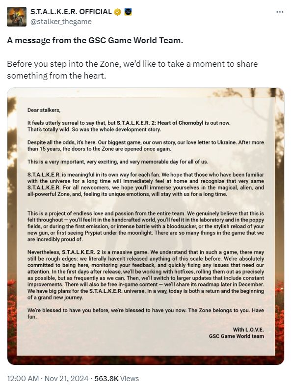 今日(11月21日)GSC Game World在推特上发文称,对“写给乌克兰的情书”感到无比自豪,但游戏开发工作还远未完成。