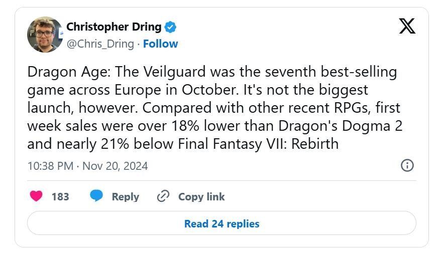 GamesIndustry 的克里斯托弗·德林最近在推特上分享了上述细节,称《龙腾世纪:影障守护者》是欧洲10月份销量排名第七的游戏。据报道,该游戏在该地区的首周销量比今年早些时候发售的《龙之信条2》低18%,比《最终幻想7:重生》低21%。