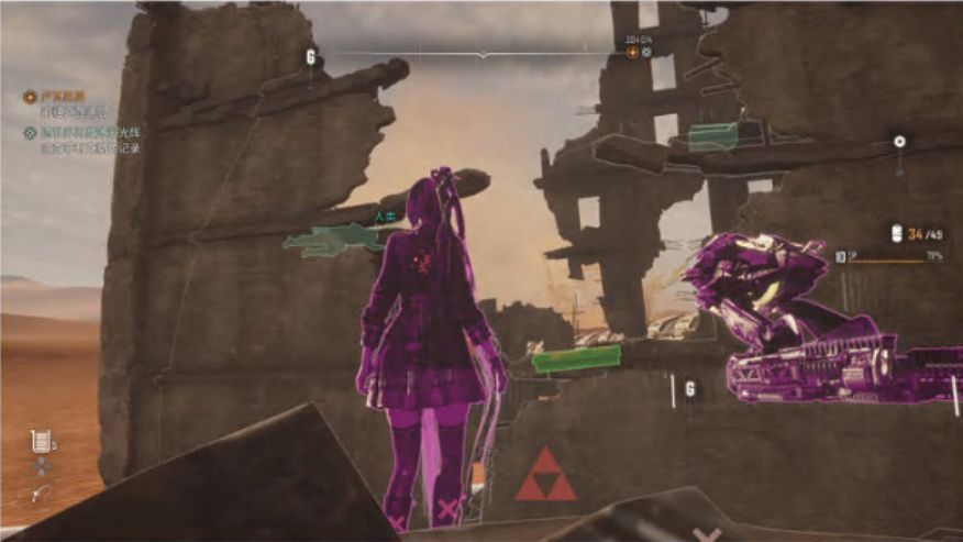 07、废墟底层有一架机器人和遗体,打爆机器人获得密码[大沙漠,日光塔区],对应粉41号箱子。调查遗体获得[记忆棒被孤立者的哀鸣]。利用废墟内侧的岩壁可以攀爬到顶层,顶层有一个箱子,打开可获得弹药补给。