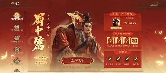 7月13日,《三国杀OL》蜀中篇正式来袭!蜀中篇预约活动如火如荼进行中!登录游戏预约即刻领取超值福利,刘焉砍价火热进行中,更有超多福利等你揭晓!