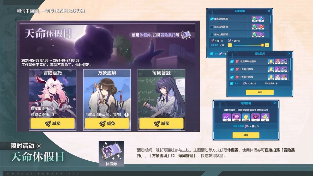 为助力舰长们减负护肝,7.6版本正式推出了「天命休假日」限时活动。活动期间,舰长可以通过参与主线、主题活动等版本内容获取休假券;使用休假券可直接扫荡「冒险委托」、「万象虚境」和「每周答题」,快速轻松获取奖励。