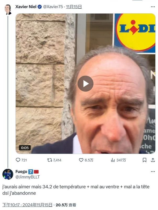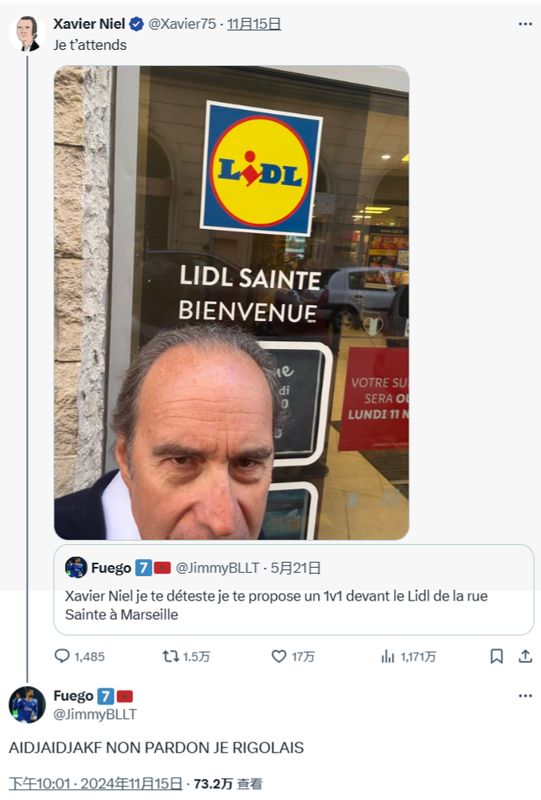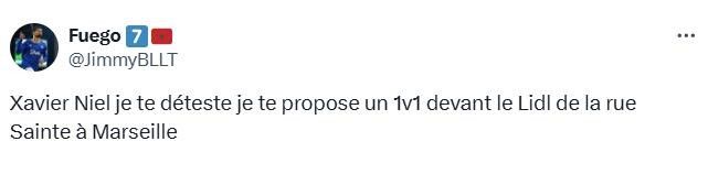 这位名叫“JimmyBLLT”在X上发帖说到:“泽维尔·尼尔,我讨厌你,我提议在马赛圣特街的Lidl超市门前来一场1v1决斗”。