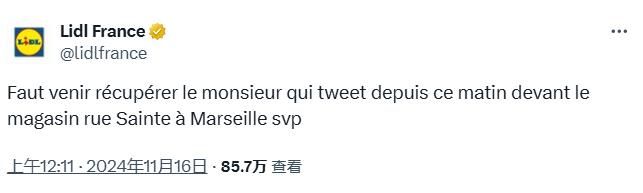 另外,Lidl超市也加入了这一行动,发帖喊话“JimmyBLLT”带走泽维尔·尼尔:“请来接走从今天早上开始就在马赛圣街商店门前发推文的那位男子”。