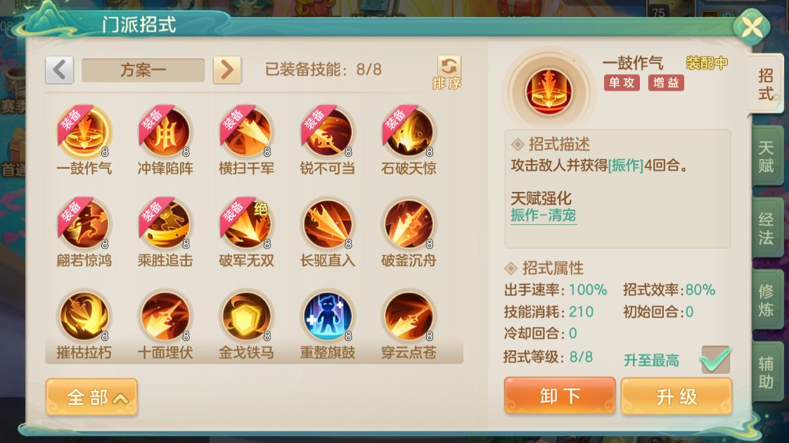 流派招式:摧枯拉朽、长驱直入、石破天惊、乘胜追击