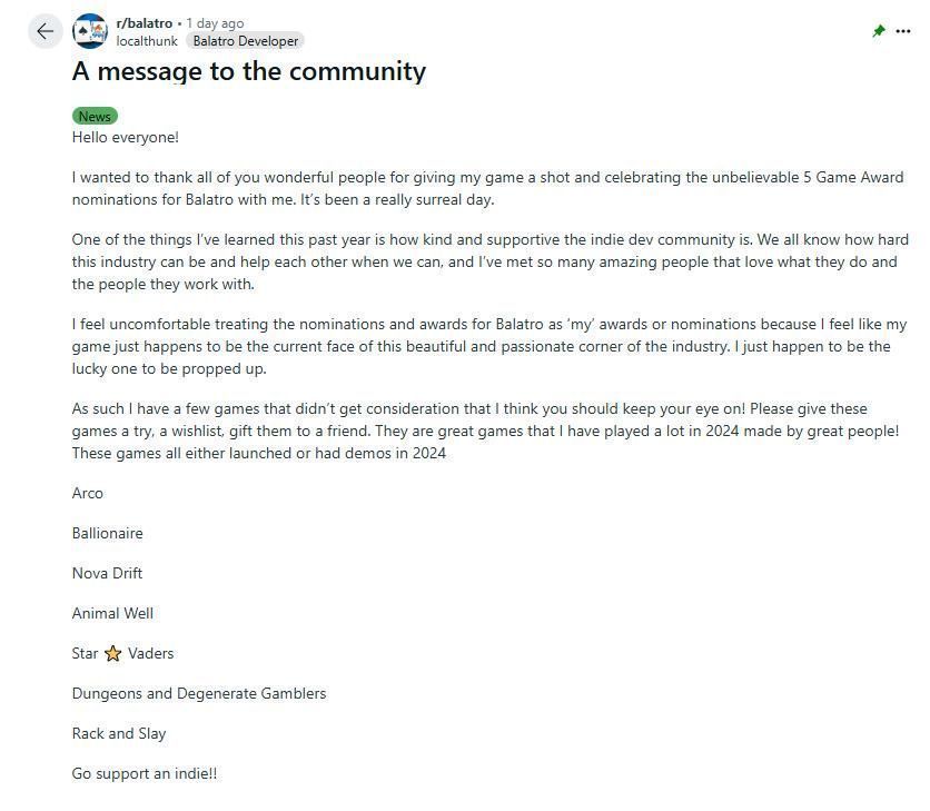 而在获得除年度游戏外共多达5个的TGA 2024提名后,LocalThunk也在reddit社区冷静回应,表示想感谢所有人,感谢“你们给了我游戏一个机会”。