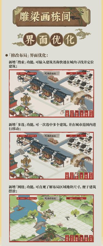 在4.0.0版本,「修改布局」功能迎来优化及功能更新,以期为知府大人建设和管理治下州府带来更好的游戏体验。