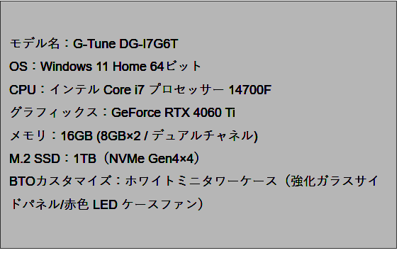·这批官方认定定制版游戏PC统一型号为G-Tune DG-I7G6T,主要配置 Core i7 14700F+GeForce RTX 4060 Ti+16GB+ SSD·1TB,官方称原价高达30万日元,不带显示器。
