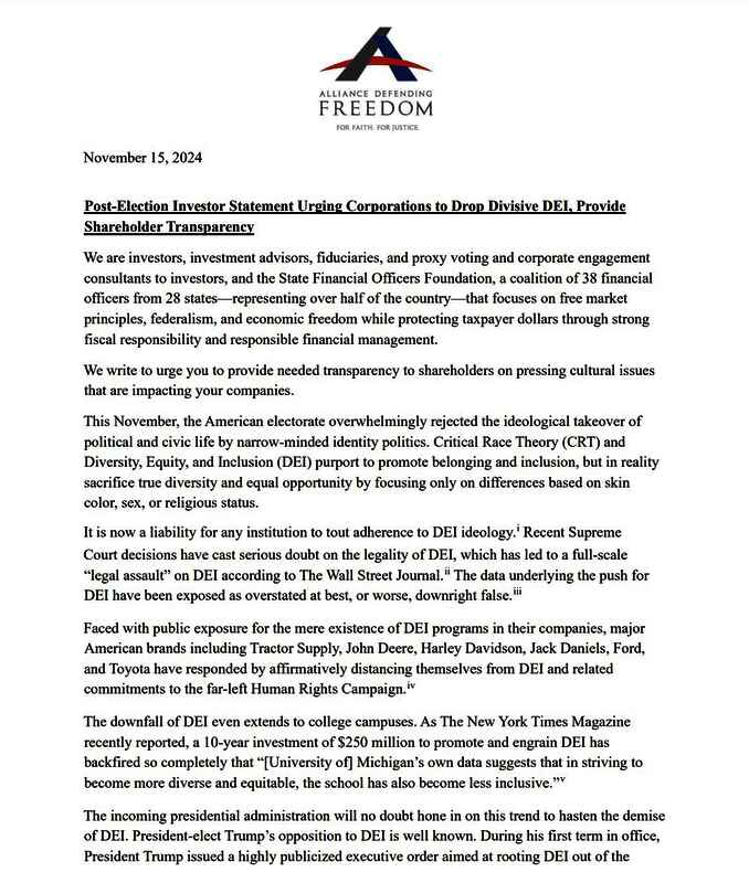 信中写道:“企业的存在不只是为了盈利。商界领袖和投资者的行为是出于改善人们生活和改善人类状况的强烈愿望。但是,如果不能正确传达正常运作所必需的美德,就会助长道德真空的感觉。正是这种做法让DEI 等意识形态首先渗透到企业中。”