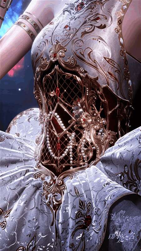 当然,这套瓷心傀儡六星套装最突破的,还是在服装的“用料”层面。在材质层面上的使用,可以说达到了业界的顶尖水平,高达148种材质的使用,让这套六星时装从发丝到特效的表现,都细腻无比。不仅如此,这套时装在设计上也加入了大量的雕花纹路和金属花纹,而且是直接叠加在半透布料上。相比于其他游戏,对于单层透光的材质都还在尝试使用贴图实现模拟效果,在《以闪亮之名》游戏中却使用了多达10层的半透明材质。显然这样呈现出的套装效果最为出色,光线穿透不同半透材质之后的柔光效果夹杂着每一层布料上的花纹,才是这套瓷心傀儡六星套装称得上开启技术3.0时代的原因。