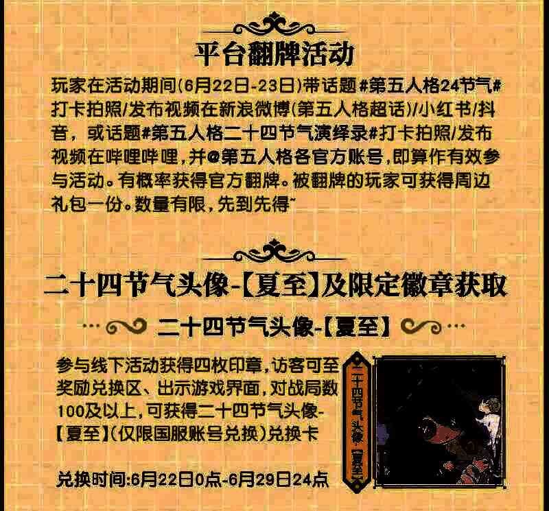活动现场还为各位访客准备了趣味十足的互动游戏,融合了《第五人格》独有的庄园特色与夏至节气文化,分别是密钥推理、庄园拼图、感时知节和一笔成型这四个妙趣盎然的小游戏。相信访客们打卡这四个互动游戏后定能对中国节气文化有更加深入的了解。玩乐的同时还能赢取代币,兑换二十四节气头像-【夏至】兑换卡、【夏至】线下限量徽章以及线下活动限定明信片等第五人格精美周边!
