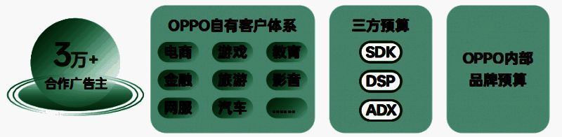 广告预算是商业收入的基础,OPPO广告联盟为开发者聚合了多种预算来源。一方面,OPPO自有的客户体系服务来自各行业的3W+广告主,同时也承接来自OPPO内部的品牌预算;另一方面,OPPO与多家三方进行预算对接,帮助开发者高效获取来来自三方的预算
