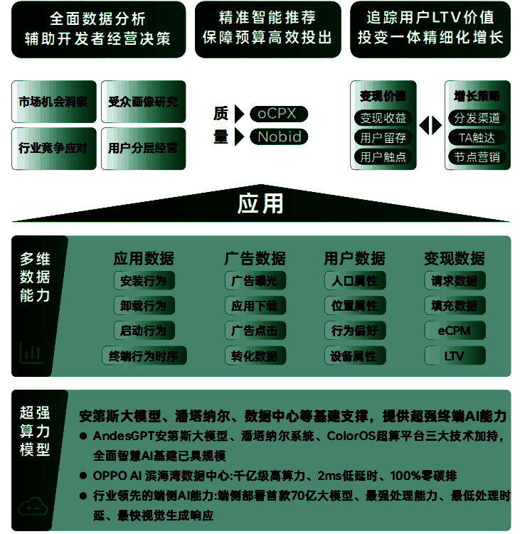 多维终端数据能力及超强的算力模式,是OPPO广告联盟实现流量价值最大化的基础。基于终端生态,OPPO广告联盟能够集合应用数据、广告数据、用户数据、变现数据等多重数据能力,通过大数据处理能力及超强算力,为开发者提供经营决策支持,保障预算高效投出,最终用户LTV价值实现投变一体精细化增长。