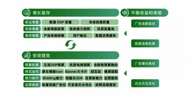 商业价值的实现不仅体现在流量变现价值的最大化,同时还需要考虑到长效、健康和可持续的商业运营。为了构建长期有效的生态环境,OPPO广告联盟聚焦于用户增长与用户体验两大核心领域,旨在打造一个稳健且富有活力的商业体系。