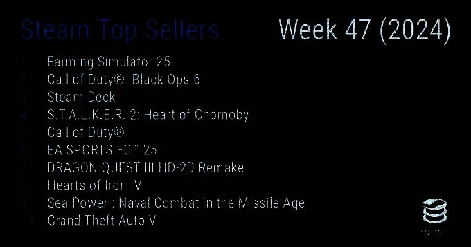 Steam最新一周销量榜出炉(2024年11月12日-2024年11月19日),本周《模拟农场25》成功登顶,新作《勇者斗恶龙3:HD-2D重制版》和《海上力量:导弹时代海战》也登上了榜单,另外本周《GTA5》也再次回到了榜单第10名。