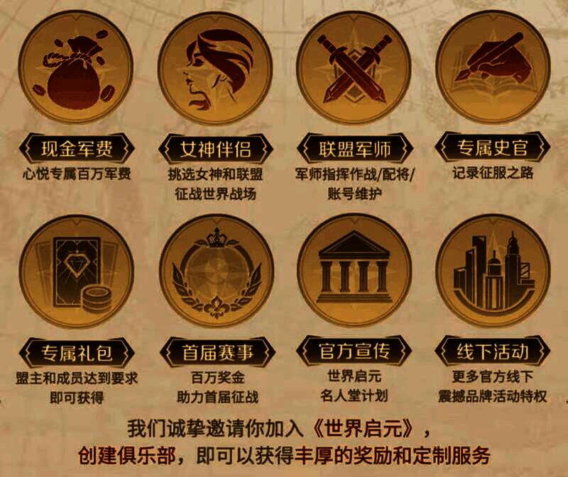 真正既玩游戏又能赚钱,更有专属定制伴侣&军师辅佐。完成活动要求在游戏不删档开启后即可领取高级招募令、金币、技能经验、心悦专属主城皮肤(心悦会员)等专属好礼,S1赛季结束联盟繁荣度达60万更可获得10000元现金奖励!马上加入《世界启元》俱乐部,提升自己俱乐部势力值,获得星级俱乐部奖励!
