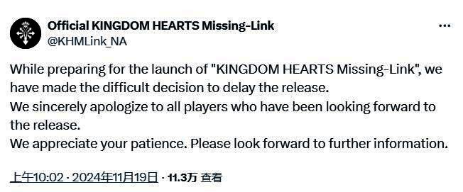 11月19日,手游《王国之心Missing-Link》官方X发文宣布,该作的发售日期将从2024年推迟到未知日期。《王国之心Missing-Link》官方X在贴文中表示:“在筹备《王国之心Missing-Link》发售时,我们做出了一个艰难的决定:推迟发售。我们真诚地向所有期待游戏上线的玩家道歉。我们感谢您的耐心。敬请期待进一步的信息。”