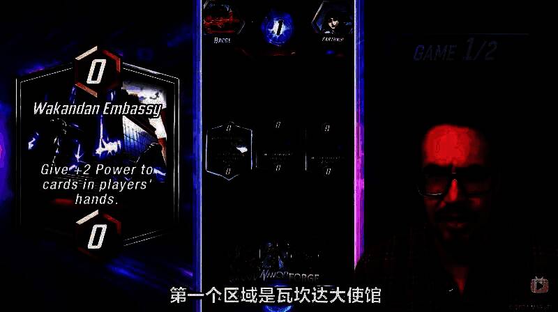 第一把的第一个地形是瓦坎达大使馆,能够为双方手牌中的每一个随从都增加两点战力。