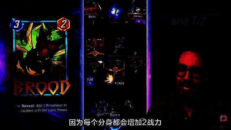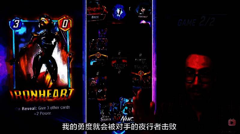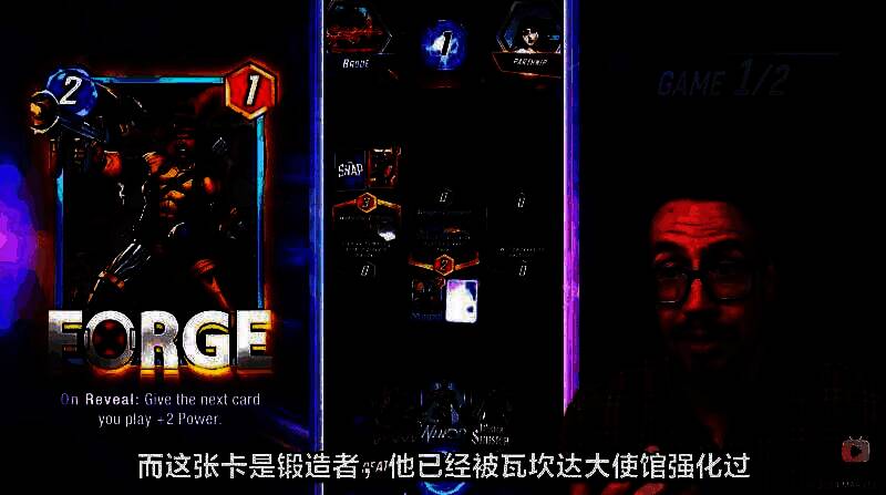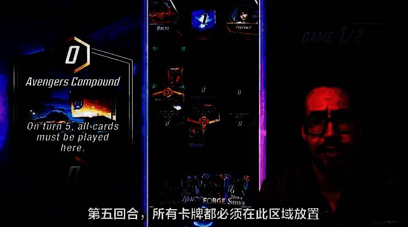 而第二回合,开启的区域是复仇者基地,意味着第五个回合,双方必须把牌放置到这个区域,Ben Brode选择了使用锻造者,以此来强化自己的下一张牌。