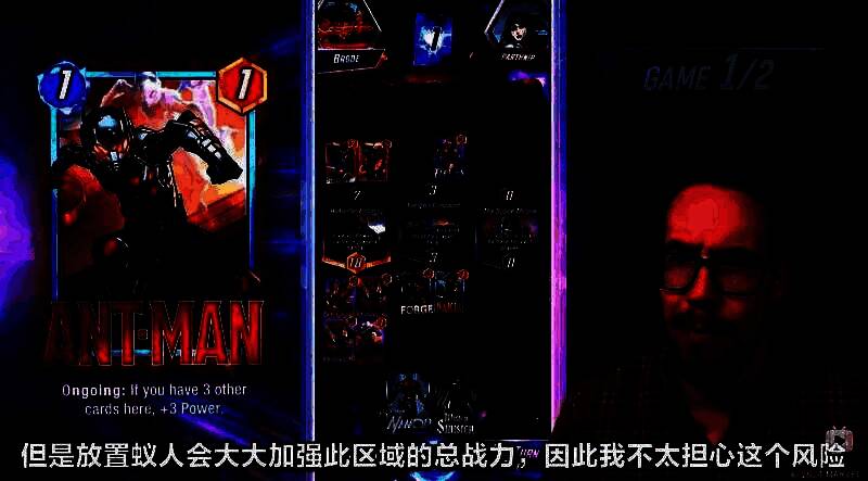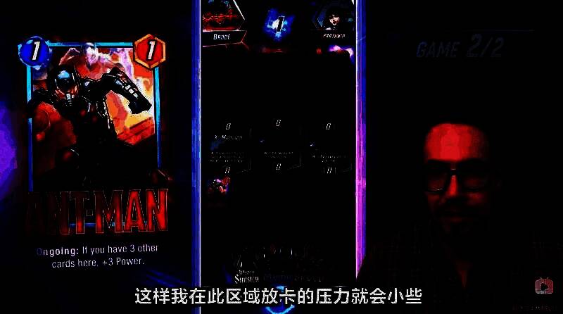 Ben Brode还在左侧的瓦坎达大使馆放置了蚁人,可以大大强化自己在这块区域的战力。但是Ben Brode也提醒大家,在放置某个区域的第四张牌时,必须要谨慎,因为这样对方就可以知晓你在这个区域的最大战力了!