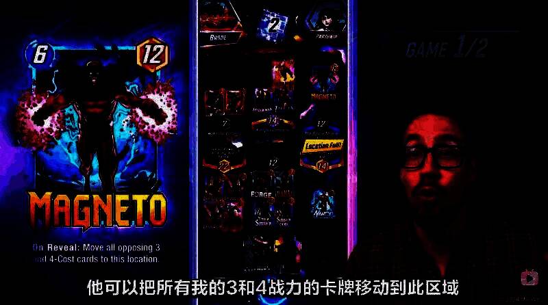 经过强化的纳摩拥有14点战力,对手放置了万磁王,可以将对方3和4战力的卡牌移动到这个区域,但是由于太空王座只能有一张卡牌,所以万磁王的效果完全没有用,12点战力的万磁王与14点战力的纳摩相比,Ben Brode取得了最后的胜利!