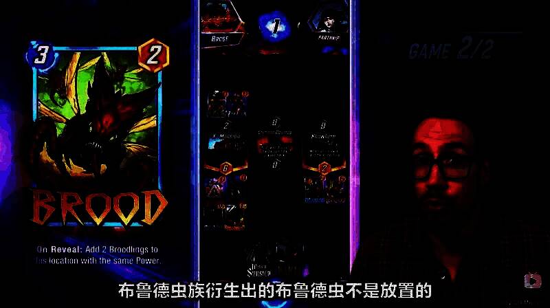 同时,第四回合,BB手上也没有大于3费的牌,所以他无法在深红宇宙放置卡牌,而虚无之地所放置的卡牌会被马上摧毁,所以也不应该投入任何卡牌,这样的尴尬,让BB十分难受。BB只好在虚无之地放置布鲁德虫族,虽然这会损失放置的那一张牌,但是衍生出的两张布鲁德虫族是不会被摧毁的,这也能巩固BB在这个区域的分数。