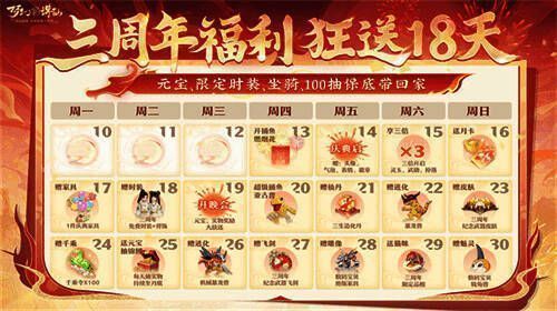 年年周年庆,三年一遇群仙盛会!盛会开场,当然少不了丰厚的周年贺礼,除首周的捕鱼返场、庆典福利、3倍惊喜、免费月卡、纪念家具、限定时装外,晚会中还揭晓周年庆典的福利清单!今日更新后,11天福利连续送不停,同时为了庆祝6月21日<三周年>主题大服的开启,新服玩家也可补领三生万物签到福利!感恩3年相伴,愿君福利满怀!