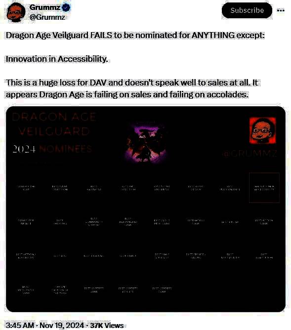 值得注意的是,《龙腾世纪4:影障守护者》没有获得年度最佳游戏提名,也没有获得最佳角色扮演游戏提名,只获得了最佳无障碍创新提名。