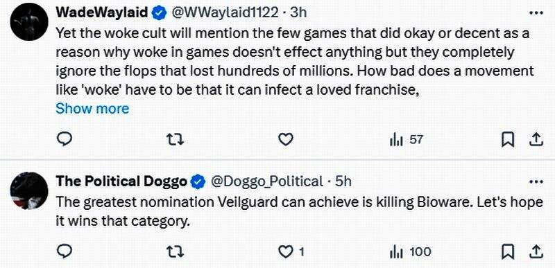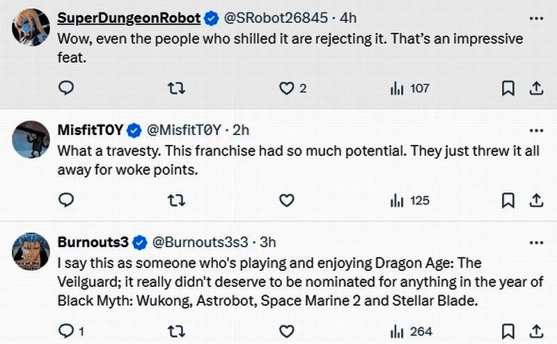 评论区有人表示:“他们获得了觉醒参与奖的提名!”“真是滑稽,本来很有潜力。他们却为了觉醒而放弃一切。”“说实话,它真不配获得任何提名。”“《龙腾世纪4》能获得的最大提名是杀死Bioware,希望它能赢得这一奖项。”