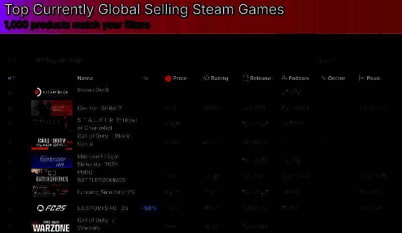 如下图所示,抛开Steam Deck和免费游戏《CS2》外,《潜行者2》已经成为Steam上当前收入最高的游戏,超过了《使命召唤21:黑色行动6》。