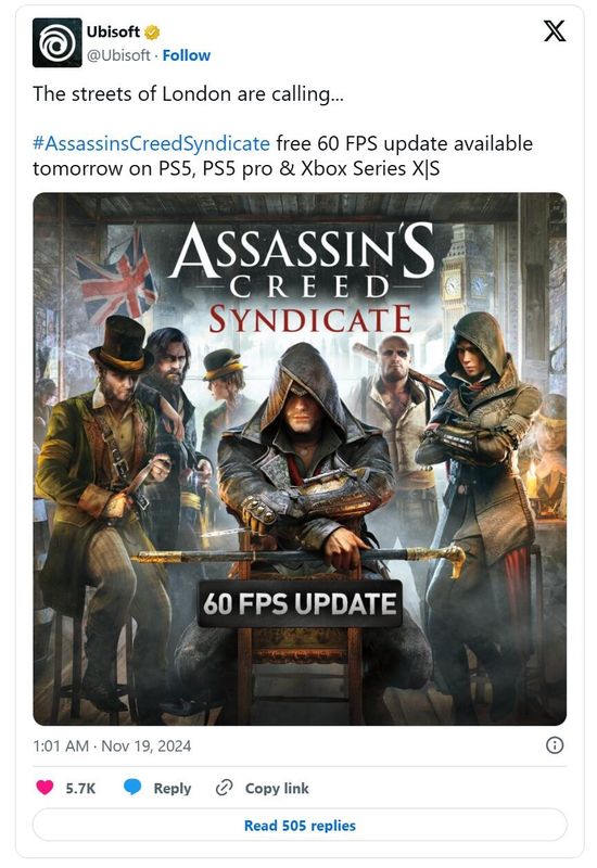 在即将于明天(11月20日)发布的更新后,《刺客信条:枭雄》将在当前世代主机上获得60 FPS的帧率。此外,育碧表示,游戏将在PS5、PS5 Pro和Xbox Series X上实现4K分辨率画面,而在Xbox Series S上将以1080p运行。需要注意的是,补丁在Xbox Series X/S上的体积将远大于PS5,前者约31.8 GB,而后者仅为0.75GB。