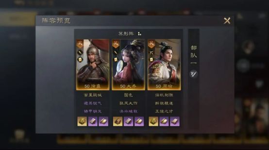 在前期,玩家提升等级的同时,需要逐渐组建三只部队,分别为任务队、主力一队、主力二队,任务队需任意1前排1奶1输出即可,该队伍顾名思义就是游戏前期过任务的。在任务队体力耗完后,由主力一队接手打地,该队伍武将阵容强烈推荐最容易获得的徐盛、孙策、大乔(孙大圣)。