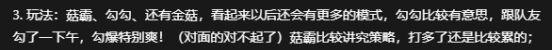 试想一下,即便是处在对方拥有9颗金菇,我方1颗没有的非常劣势的情况下,也可以通过击败对方携带9金菇的玩家来瞬间拿到10颗金菇,接着疯狂逃窜苟住15秒来获胜。这就是玩法规则上带来的刺激感和趣味性。