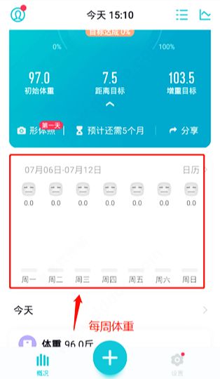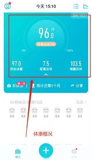 7、上面是体重概况,点击圆圈可快速添加今日体重,点击对应数据可快速设置或修改;