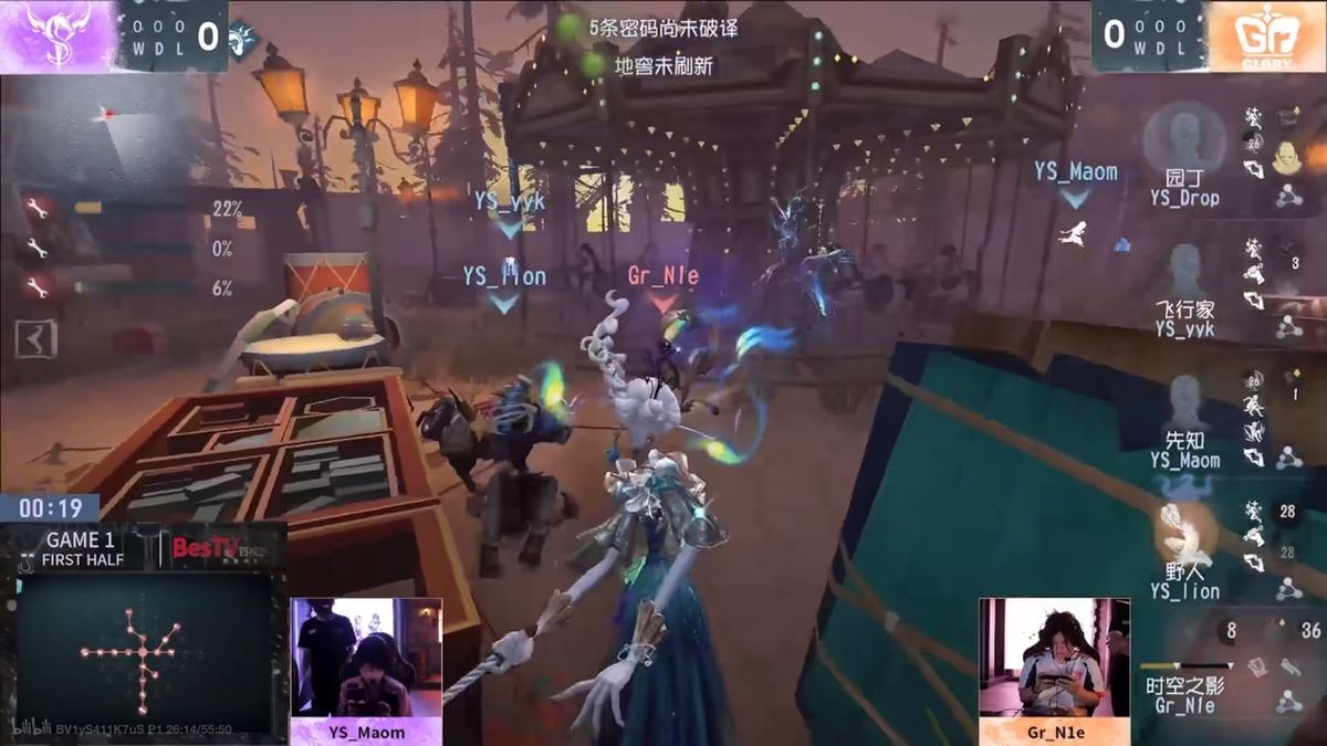 第二天,YS vs Gr 第一局上半局,Gr_N1e时空之影行云流水,极致追击拿下四抓:Gr_N1e时空之影携带张狂挽留天赋,开局大胆追击野人,寄宿后传送,凭借超高熟练度本体和伊斯人丝滑切换,本体零卡位进入双板区,极限出刀后被砸板反而替换攻击后摇,使得Gr_N1e可以迅速切伊斯人使用异族本相成功打断野人上猪并达到100侵蚀度,再秒切本体绕路,开局二十秒完成击倒,此时密码机进度仅30%。在守椅战中精准打针对不给野人二次牵制的机会。先知吃刀二救后,Gr_N1e选择换追,二阶技能寄宿后侵蚀度涨满,先知被击倒换挂,此时密码机进度仍不足两台。后Gr_N1e针对先知将其淘汰,逐一击破,拿下四抓。