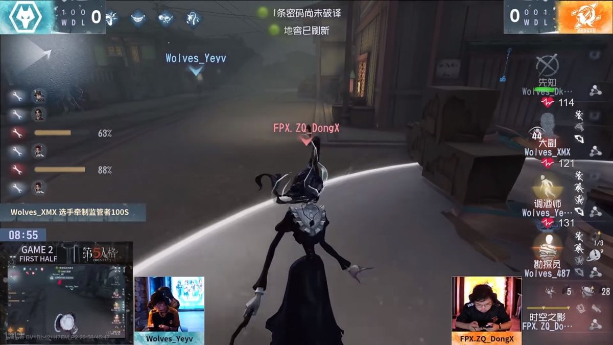 第二天,FPX.ZQ vs Wolves 第二局上半局,FPX.ZQ_DongX时空之影教科书级别控场六分钟四抓:FPX.ZQ_DongX时空之影开局追击先知,伊斯人路途中细节寄宿调酒师形成陶片,封住先知转点路径,先知飞轮抵挡侵蚀度拉开身位,一路从永眠镇假门牵制到独栋,可惜失误被电车撞晕,勘探员欲用磁铁解晕不成,先知被挂进地下室,密码机进度三台。FPX.ZQ_DongX伊斯人远程拦截到救人的大副,淘汰进度过半后逼迫其秒救。FPX.ZQ_DongX选择留在地下室打双倒并挂上,凭借敏锐嗅觉用伊斯人找到倒地先知,寄宿传送将其淘汰,进入最后半台密码机控场。FPX.ZQ_DongX追到勘探一刀后,赶往遗产机处追击调酒师,逼迫求生者新起密码机,消耗调酒师道具后寄宿远端另一台密码机的勘探员,两边围绕两台密码机开始拉扯。FPX.ZQ_DongX时空之影本体使用移形拉近身距,消耗大副怀表,又精准排到勘探员与调酒师调整状态的位置,伊斯人寄宿本体传送,双异族本相拿到调酒师一刀,秒切伊斯人赶往假门遗产机寄宿,将伊斯人拉回墓地地窖遗产机处后,假意追击调酒师,等到大副开始拆陶片时传送假门追击,勘探员拆陶片时再寄宿,拉回伊斯人至假门,本体传送回到墓地处。调酒师为逃避追击选择上车,但下车点正好是假门处,FPX.ZQ_DongX直接调动假门处伊斯人,寄宿传送,击倒调酒师挂在一处遗产机。FPX.ZQ_DongX使用伊斯人寄宿勘探员控住另一台遗产机,一边守椅一边留意勘探员侵蚀度,发现侵蚀度达到一百后传送,被磁铁弹开但是极限恐惧震慑勘探员,再传送回假门,移形拉近距离击倒调酒师二次挂上椅。勘探员自愈后FPX.ZQ_DongX如出一辙找准时机传送,侵蚀度打断勘探员翻板,勘探员再次被击倒。FPX.ZQ_DongX选择求稳,将勘探员挂在88%的墓地遗产机。满状态大副欲强行破译,残状态调酒师偷人,FPX.ZQ_DongX确认调酒师无法卡半救下后选择给侵蚀度上满的大副一刀,再传送到刚刚救下人的无道具调酒师处将其击倒淘汰。双人开门战,伊斯人和本体各控一个门,伊斯人等待大副贴门伺机而动,FPX.ZQ_DongX再次敏锐嗅觉排到勘探员位置,步步压迫,持续六分钟控场后稳健拿下四抓。
