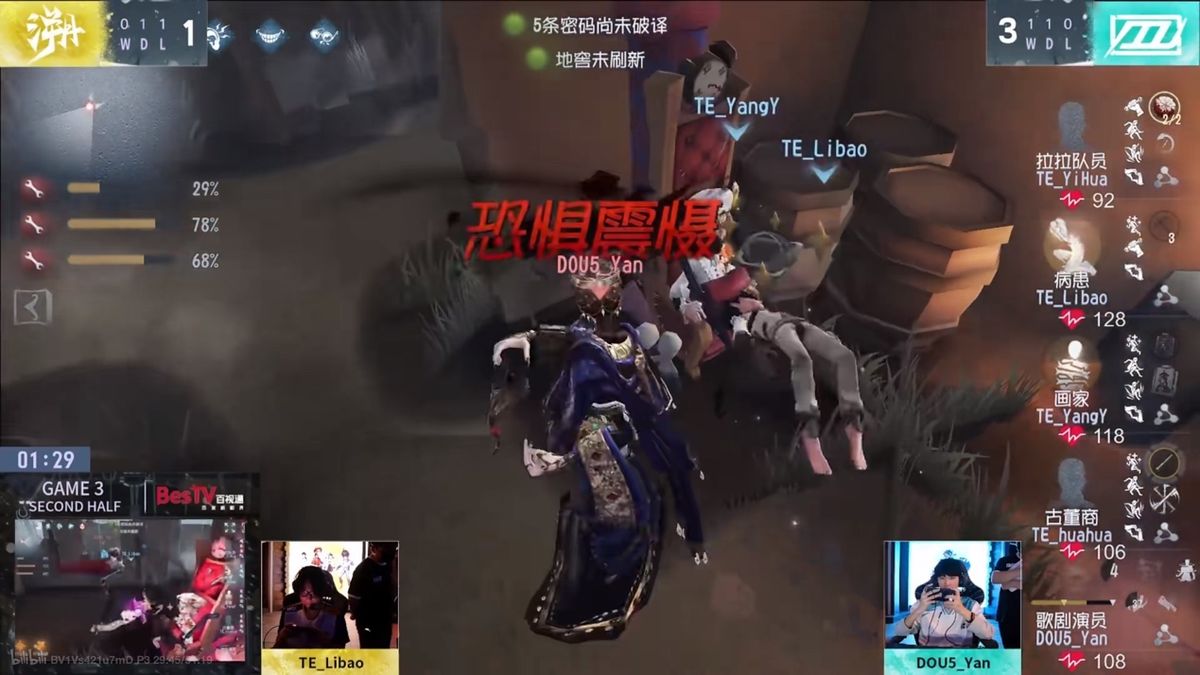第二天, DOU5 vs TE第三局下半局,DOU5_Yan歌剧演员,恐惧震慑压迫四抓:DOU5_Yan歌剧演员开局追击画家迅速拿到第一刀,熟练出影跃极限隔窗刀,四十秒击倒画家,密码机总进度约60%。在守椅战中,不慌不忙,虽然是无淘汰进度限制的画家却成功恐惧震慑病患,将其牵远后放下,和拉拉队员同时赶到椅下,DOU5_Yan稳健博弈,卡淘汰进度到最后,出刀后画家淘汰,拉拉队员没能救下人,病患被无缝续节奏挂上椅。DOU5_Yan果断底牌切闪现过窗又击倒拉拉队员。古董商救下病患后吃刀,DOU5_Yan优势巨大,换挂拉拉队员,全员残状态,歌剧演员逐一击破拿下四抓。