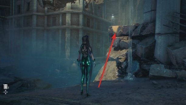 打开大门后,爬上右侧黄色边缘便可发现一具尸体,调查获得【记忆棒451号军团战士的决心】。