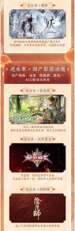 周年庆典将至之时,国风天团2.0也将惊艳来袭,实力歌手袁娅维、Faye詹雯婷、黄龄等大咖都将入驻会呼吸的江湖!联动也异常精彩:中华民族精神图腾之一的经典巨作《西游记》也打破六界束缚来到了逆水寒,开启重磅的【西游篇特别国风企划】;国画风知名IP“吾皇猫”、经典影视《铠甲勇士》、国风动漫《眷思量》联动第二弹、优秀国产游戏《阴阳师》等联动也将震撼来袭……跨越千年的国风精粹,遇上多元的潮流文化,将在逆水寒手游2.0版本迸发前所未有的全新国潮火花!