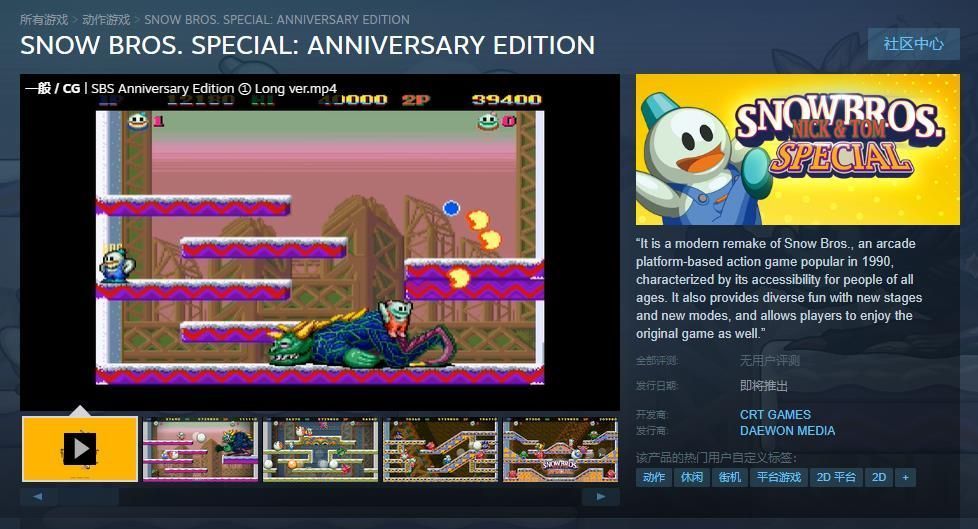《雪人兄弟特别:周年纪念版》(SNOW BROS. SPECIAL: ANNIVERSARY EDITION)Steam商店页面正式上线,发售日期待定,不支持中文。