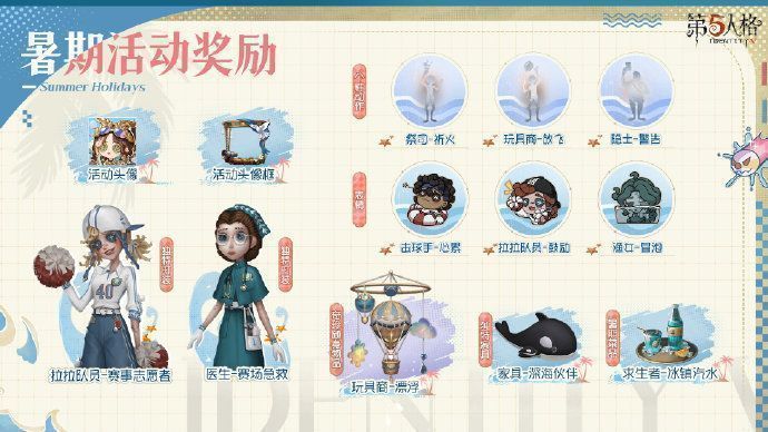 首先是第五人格暑期主题活动即将在7月25日维护后开启,玩家们完成指定任务即可获得【奇珍随身物品】玩具商-漂浮,【独特时装】拉拉队员-赛事志愿者、【独特时装】医生-赛场急救,以及活动主题头像、头像框、个性动作、表情、家具等丰富奖励。