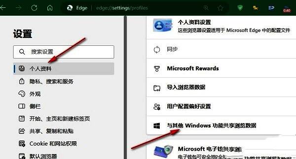2、进入到“设置”界面之后,点击左侧栏中的“个人资料”选项,随后找到并点击右侧中的“与其他Windows功能共享浏览数据”。