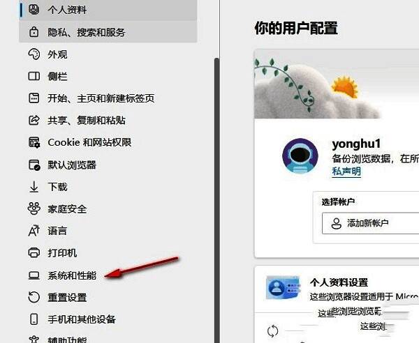 3、进入到“设置”界面之后,点击左侧栏中的“系统和性能”选项。