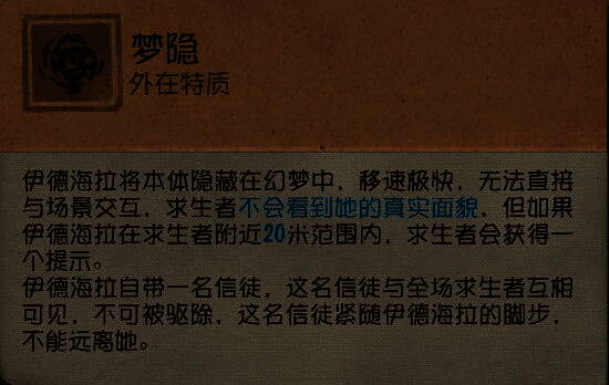 ③梦之女巫的本体无法直接攻击求生者,也无法直接破坏木板,需要依靠信徒完成这些操作。