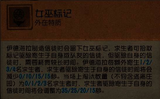 ①拾取了女巫标记的求生者可以给自己或他人驱除信徒,为自己驱除信徒会比为他人驱除信徒耗费更长时间;