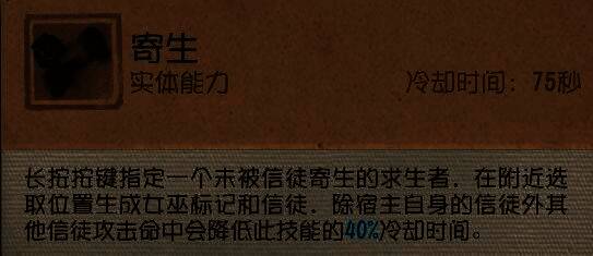 ②当使用除了宿主的寄生信徒外任一其他信徒攻击命中该求生者时,寄生技能的冷却时间会降低40%。