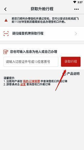2、输入订座证件号或者13位客票号,点击“获取行程”选项,然后按照指示进行操作即可。