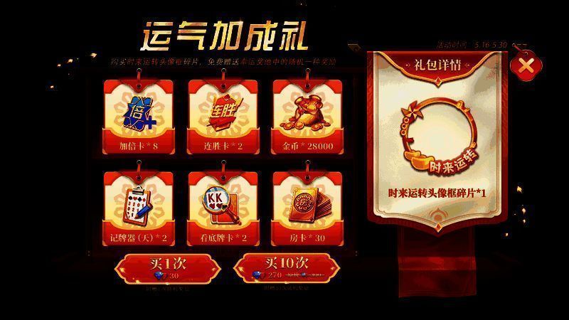 小满之际,如何加满好运?来《网易棋牌》手游领取【运气加成礼】即可得!5月16日至5月30日,牌友们通过购买时来运转头像框等道具,购买一次或十次可得不同的额外奖励,连胜卡、房卡等道具惊喜掉落,助一路胡牌不停!